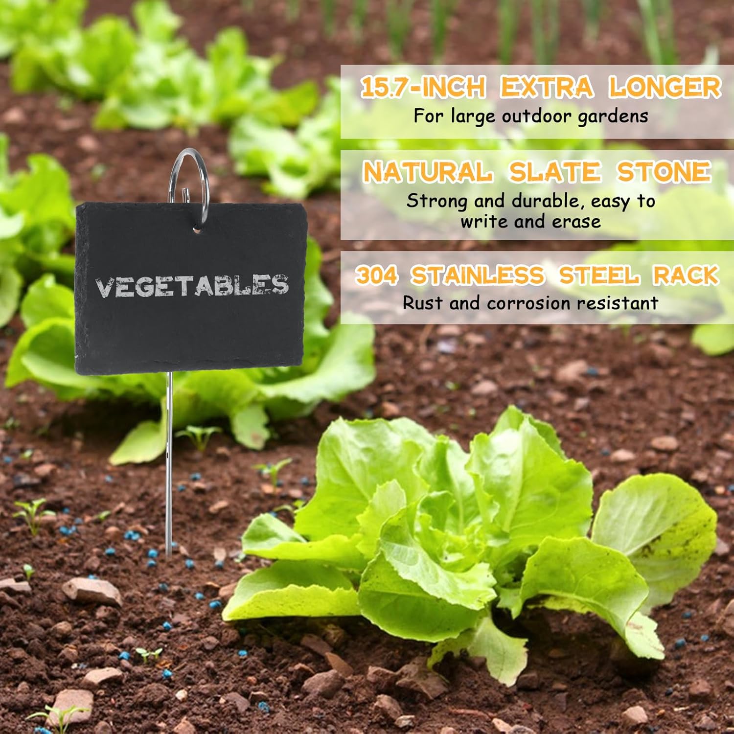 - High Quality: The slate plant markers is made of natural and durable slate stone, with chipped edges, not brittle or snap; It is suspended by rust proof steel rods and can be staked in garden beds, plant pots and flower boxes