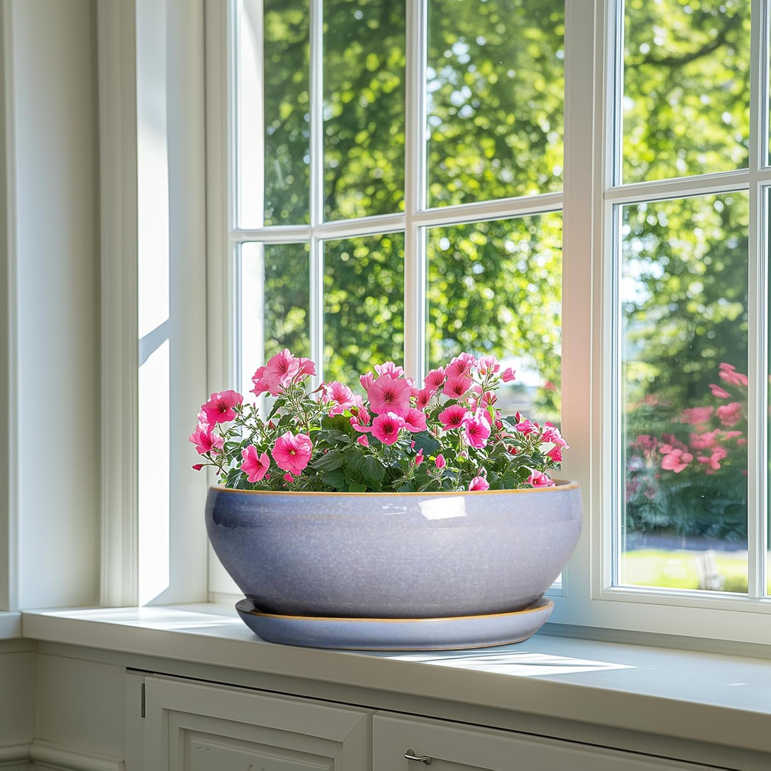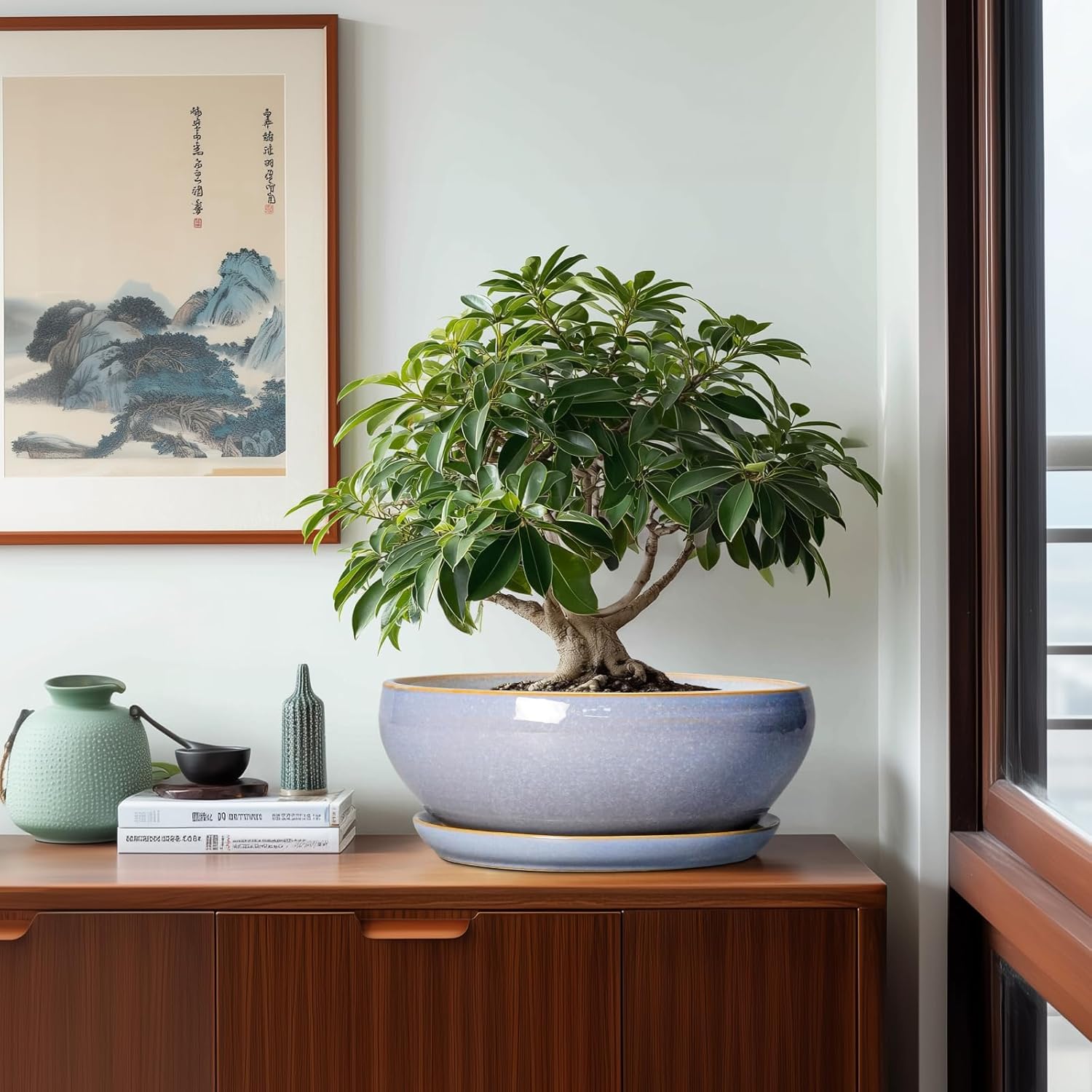 SQOWL 12 Inch Bonsai Pots - Shallow Ceramic Planter for Indoor Plants Outdoor, Large Succulent Pots with Drainage Hole and Saucer, Round Planter Bowl, Porch Decor, Gifts for Plant Lover, Blue