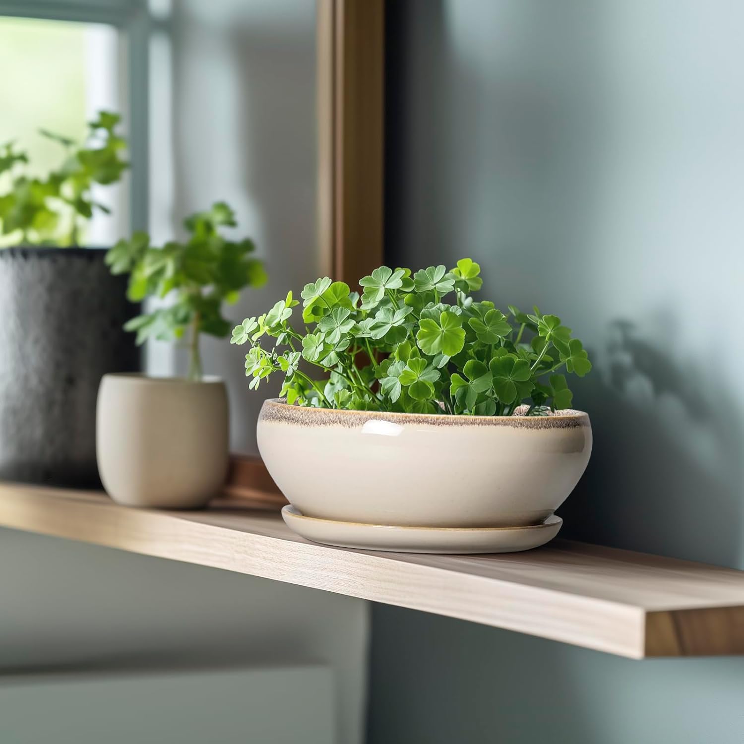 SQOWL Succulent Pots 8 Inch - Ceramic Bonsai Pots for Indoor Plants, Round Shallow Plant Pot with Drainage Hole and Saucer, Bowl Planter Outdoor, Patio Decor, Plant Lover Gifts, Beige