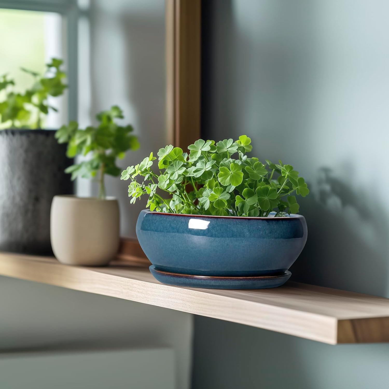 SQOWL Bonsai Pots - 8 Inch Ceramic Succulent Pots with Drainage Hole and Saucer, Round Shallow Planter for Indoor Outdoor Plants Flowers, Ceramic Planter Bowl, Room Decor, Gardening Gifts, Blue
