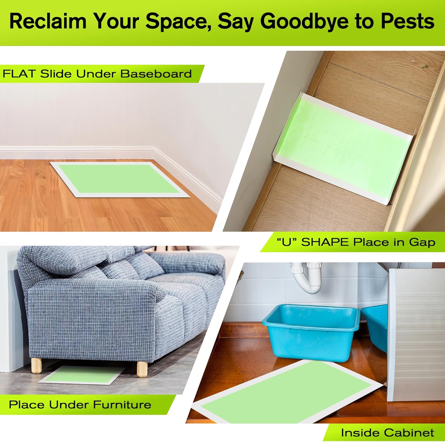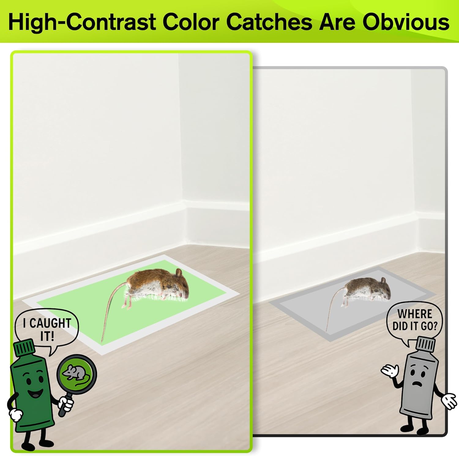 - [Green Glue Stress Free Check ]Our mice glue boards utilize an advanced glue formulation for catch and hold. High contrast glue color allows for quick rodent identification no need to get too close and face an uncomfortable sight. Note: Rodent may still be alive when trap is checked