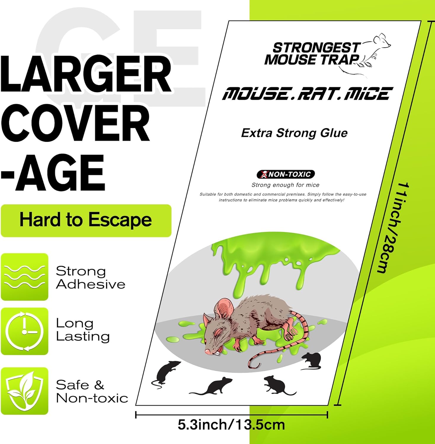 - [Huge Sticky Trap Nowhere to Run]Each mouse glue traps measures 11 x 5.3 inches/ 28 x 13.5 cm, larger than standard traps covering more area to catch more rodents in one go. The extended surface increases the catch rate and reduces escape chances