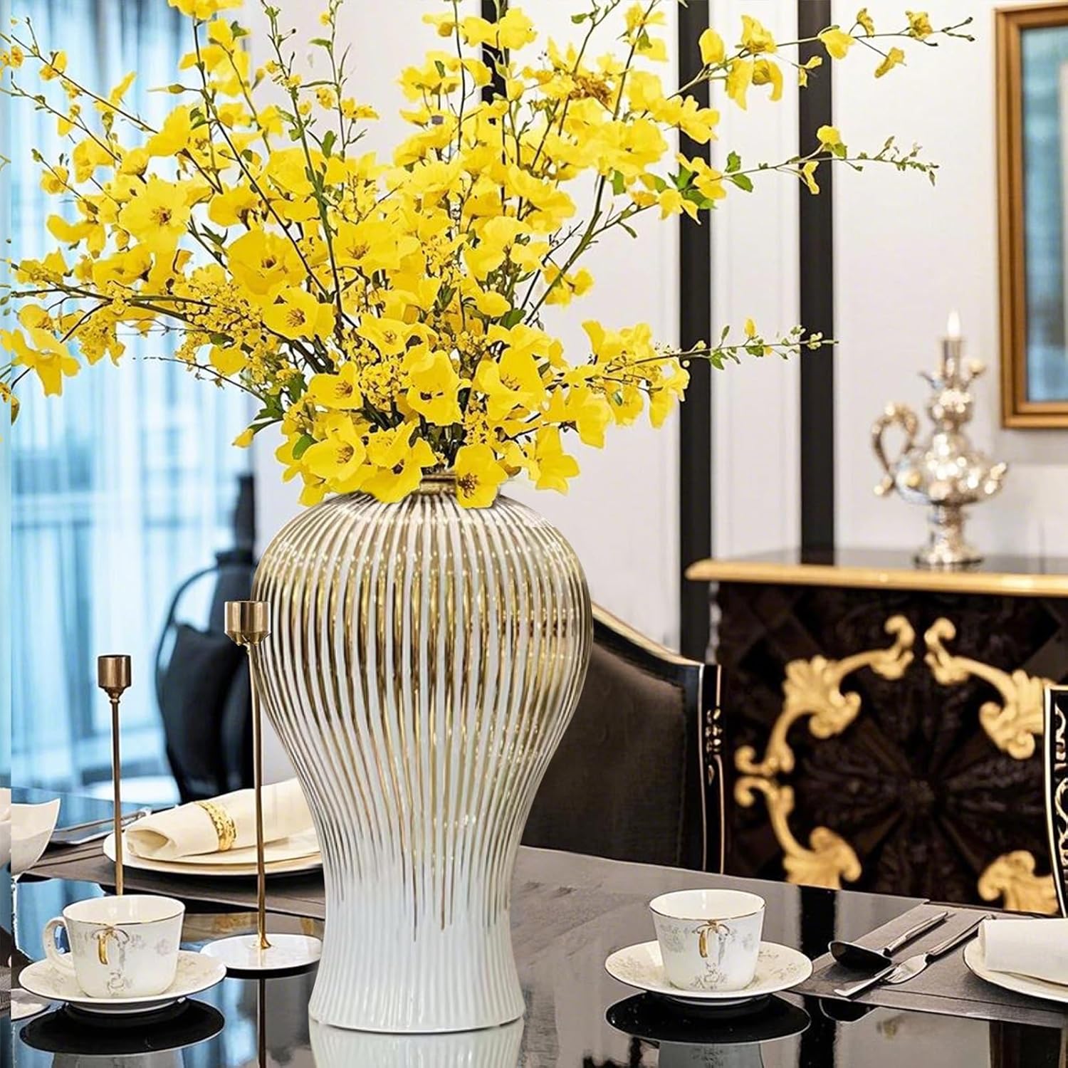 - 【Modern Gold and White Vase】Classic for your home decor. White Glossy Smooth Glazed Surface with gold trim fit for most home decor collections. Work great with your exotic houseplants, florals, and beautiful bouquet.