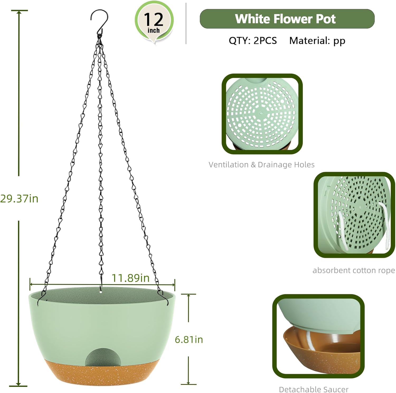 - 【Package Content】12 Inch Self-Watering Plastic Flower Pots x 2,Chain rack x 2,these Planters are easy to install and suitable for Hanging in various locations such as Balconies, Windows and Gardens