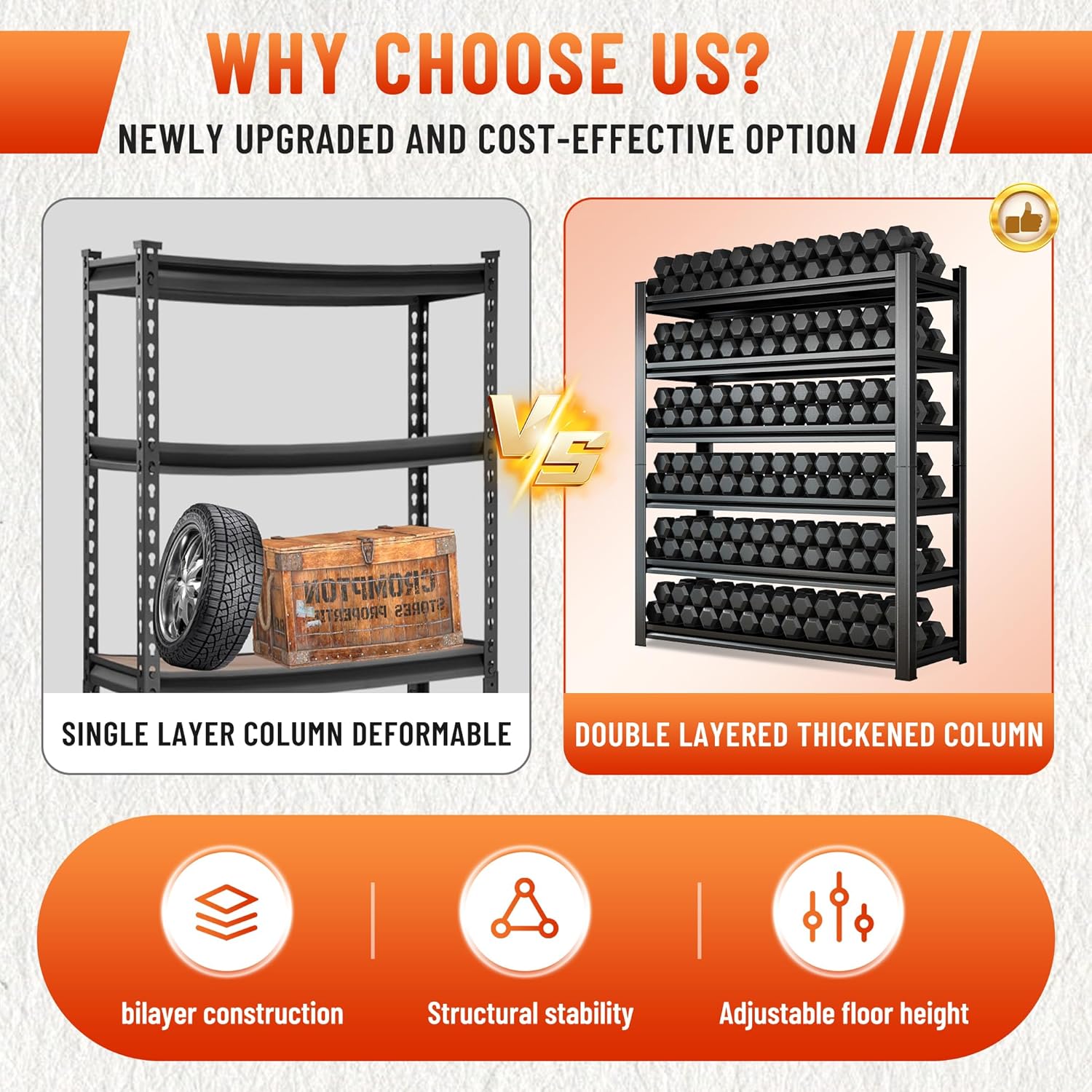 - ăFlexible Height Adjustment, Greatly Improve Space UtilizationăThis garage shelf can freely raise and lower the height of the five tiers of boards through the design of micro-adjustable slots, which can accurately match the different sizes of items from toolboxes and paint buckets to engines, containers and other items, and improves the utilization rate of each tier! The garage shelves are designed with tool-less adjustments, locking with the push of a finger, no need to remove bolts, and switching can be done in less than 30 seconds.