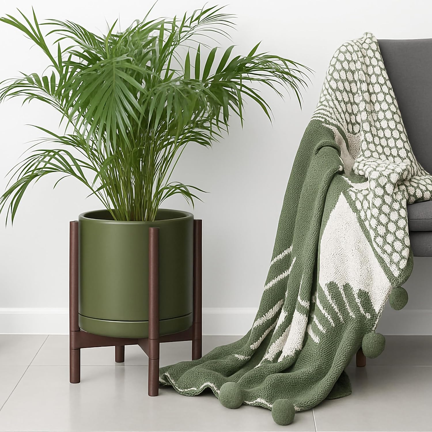 D'vine Dev Ceramic Planter with Walnut Color Stand - 12 Inch Modern Round Flower Pot with Wood Planter Holder, Olive, 55-B-W-J