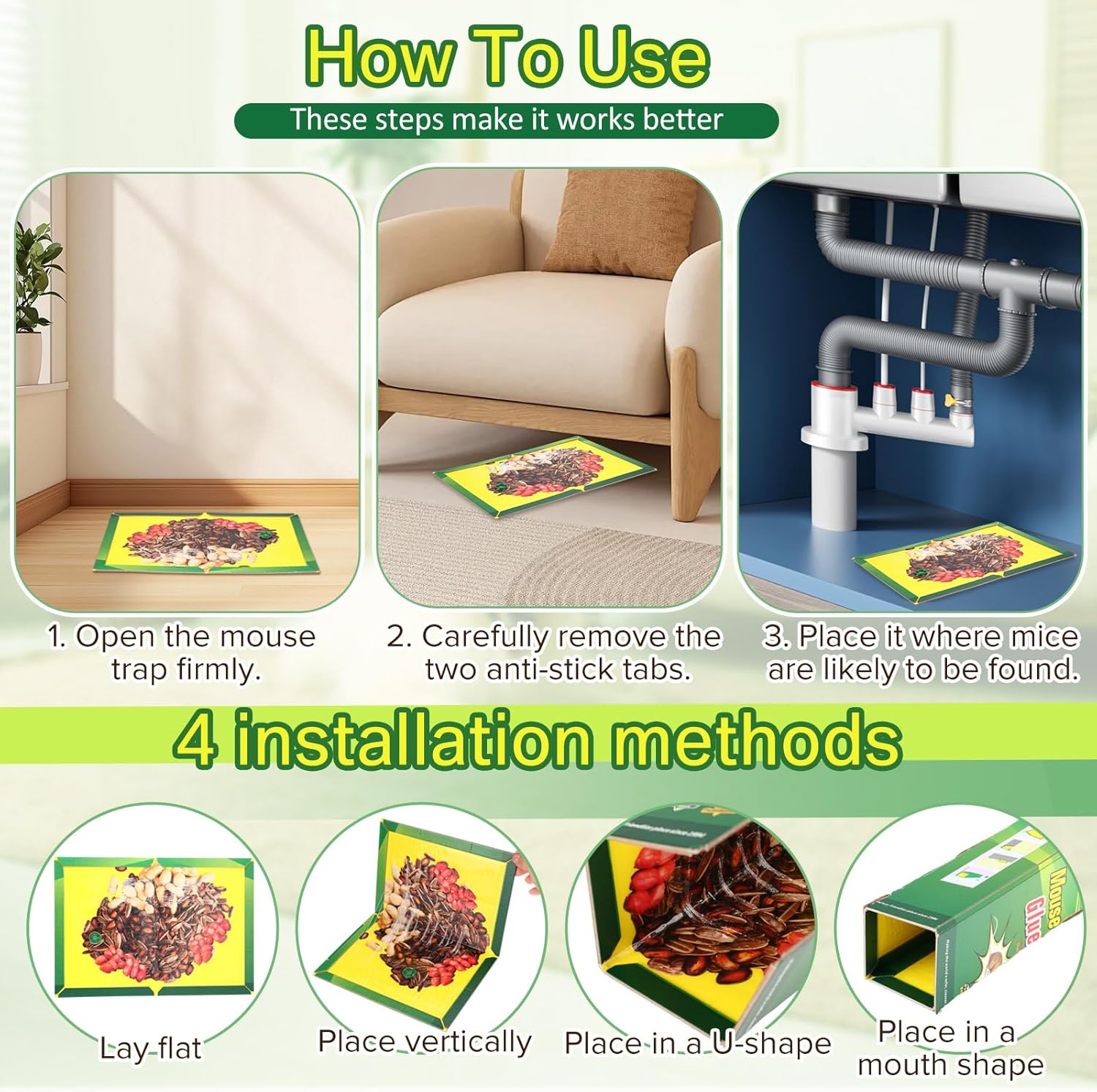 - Easy to Use and Clean: you just need to place these mice traps where mice frequent, no need to set up or place bait! It tears cleanly from the floor, leaving no residue; Simply fold the trap inwards for hygienic disposal