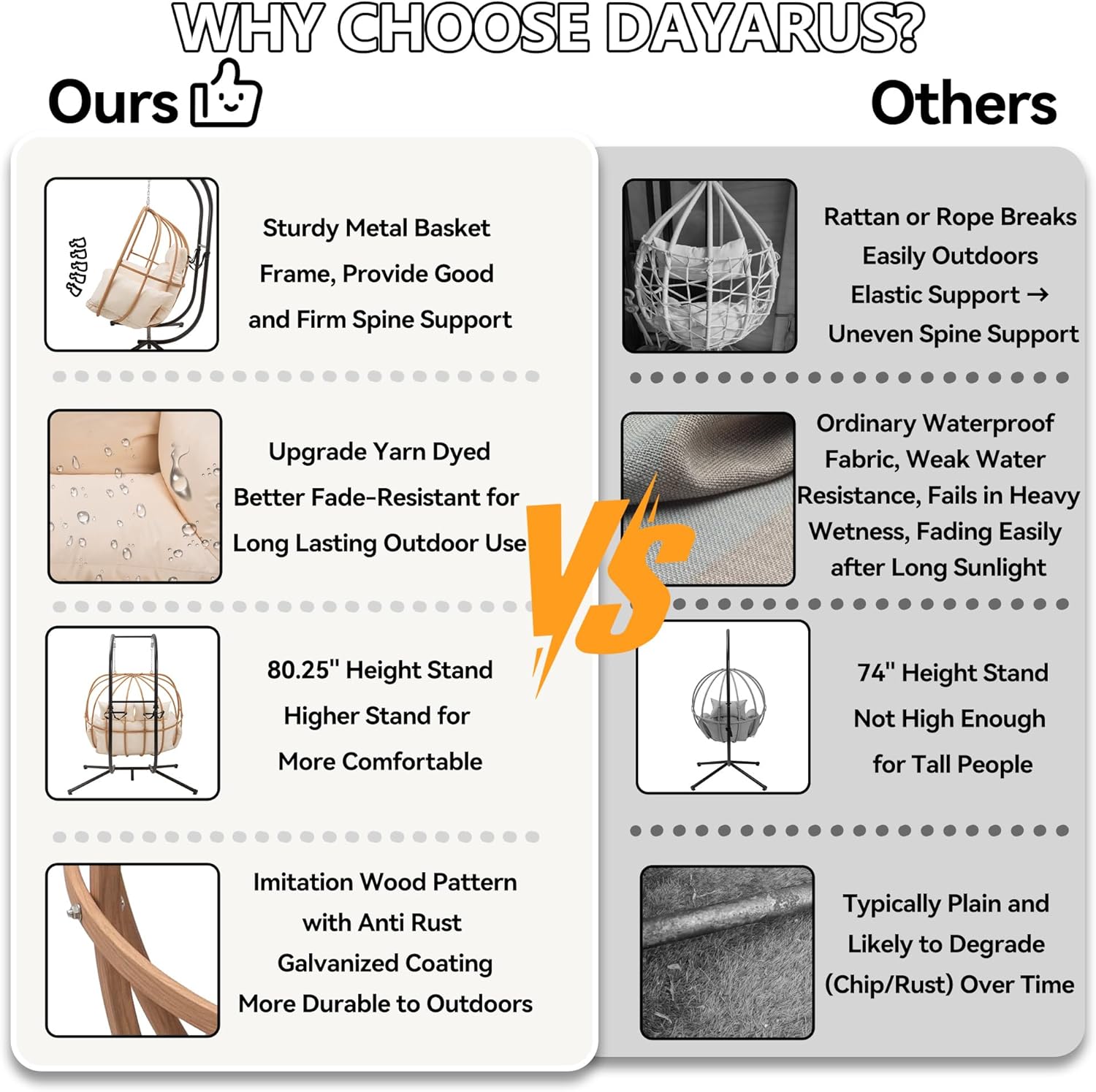 - Upgraded Quality: The outdoor egg chair has a fluffy cushion for soft sitting. its upgraded waterproof fabric resists sun, won't fade, suits all - weather use, and cleans easily, ensuring lasting outdoor use