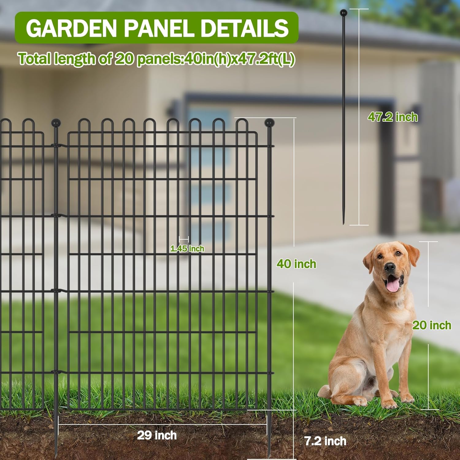 20 Panels No Dig Decorative Garden Fence with 2 Gates for Yard, 40 in(H) X 47.2 ft(L) Animal Barrier Fencing for Outdoor Dog, Metal Portable Garden Fences for Borders, Pets, Landscape, Temporary Fence