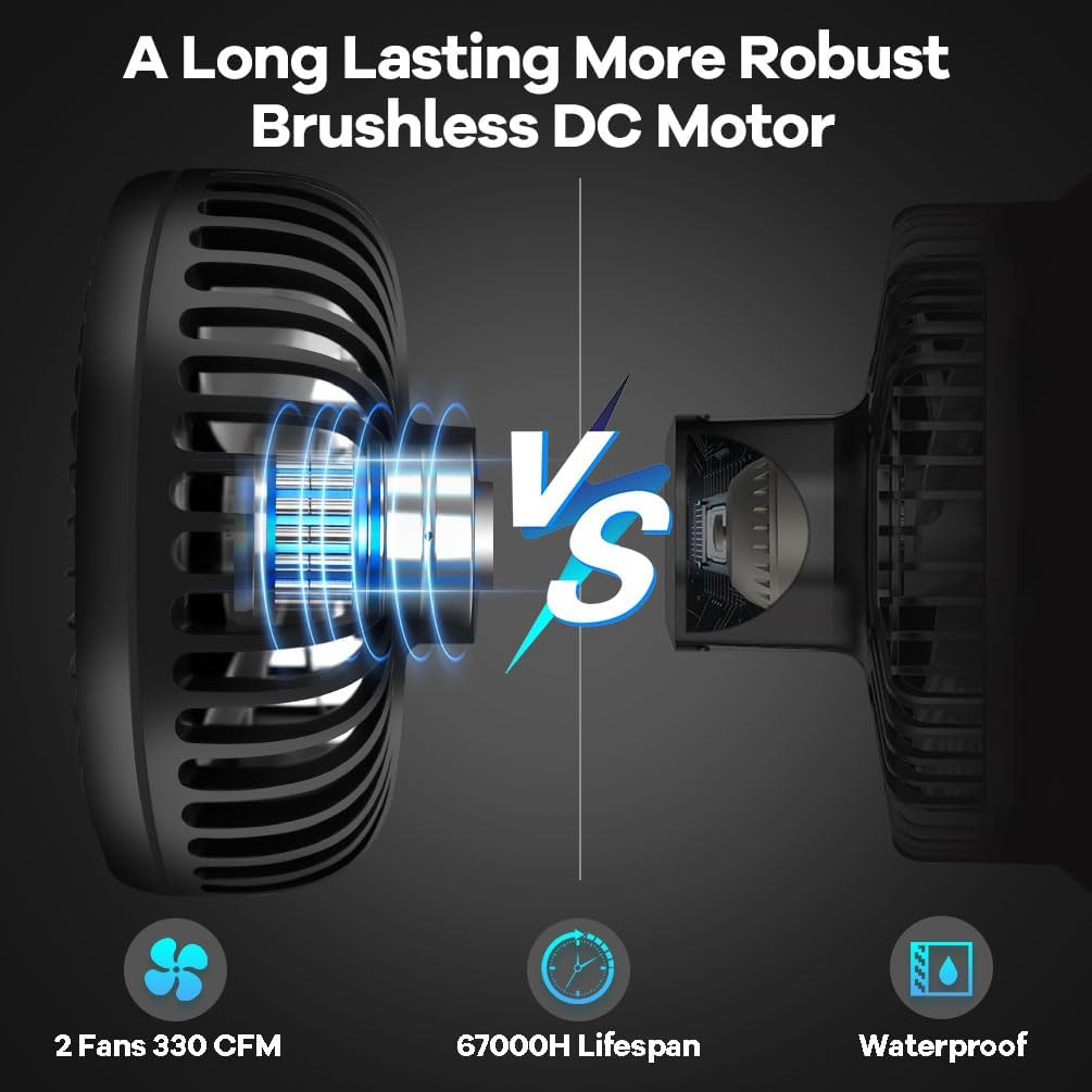 - Strong Airflow with Few Noise: The clip on double fans equipped with a 12W adapter can output max airflow 330CFM 3700 RPM with a few noise of 53dBA. In the lower speed level, the noise decrease to 37dBA. Also itโs IP54 waterproof which can work in a humidity environment.