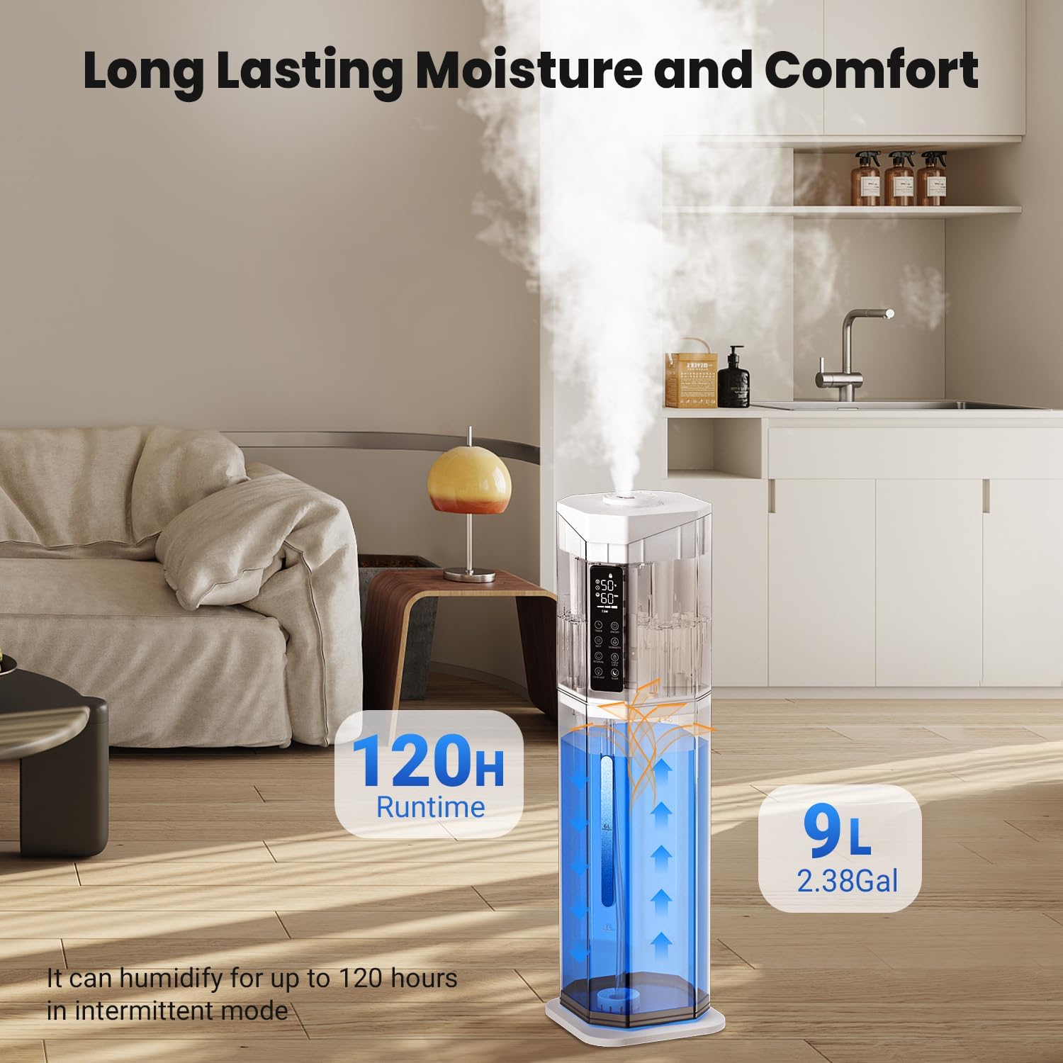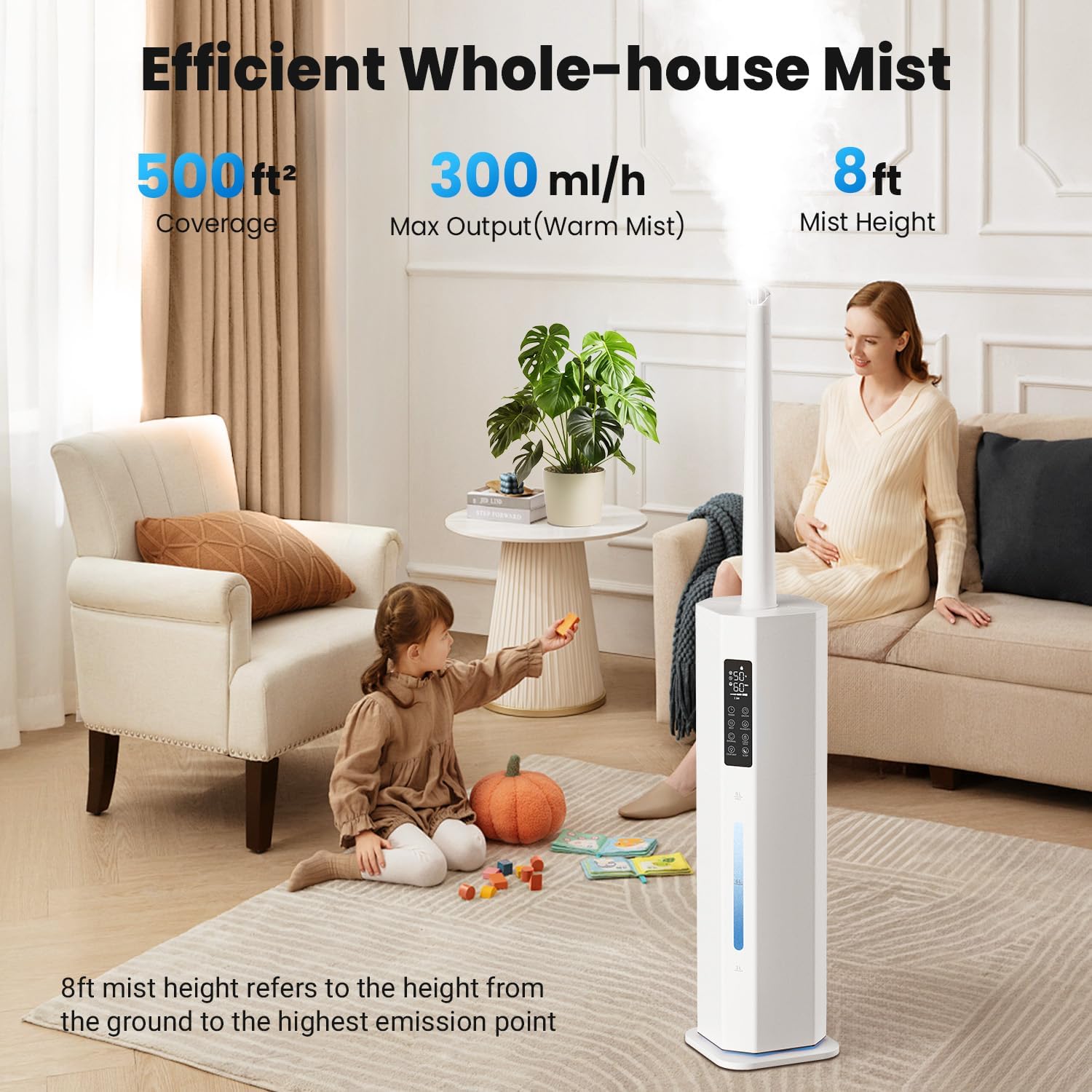 - 𝑺𝒖𝒑𝒆𝒓-𝒍𝒐𝒏𝒈 120𝑯 𝑹𝒖𝒏𝒕𝒊𝒎𝒆 & 𝑬𝒙𝒕𝒆𝒏𝒔𝒊𝒗𝒆 500 𝒔𝒒 𝒇𝒕 𝑪𝒐𝒗𝒆𝒓𝒂𝒈𝒆: Tired of constant refills? Features 3 adjustable mist levels (max output: 300mL/h). This top-fill whole house humidifiers runs up to 120 hours on a single fill (Interval Mode on), minimizing hassle. Enjoy healthier air across spaces up to 500 sq ft – perfect for nurseries, bedrooms, living rooms, offices, greenhouses, and more