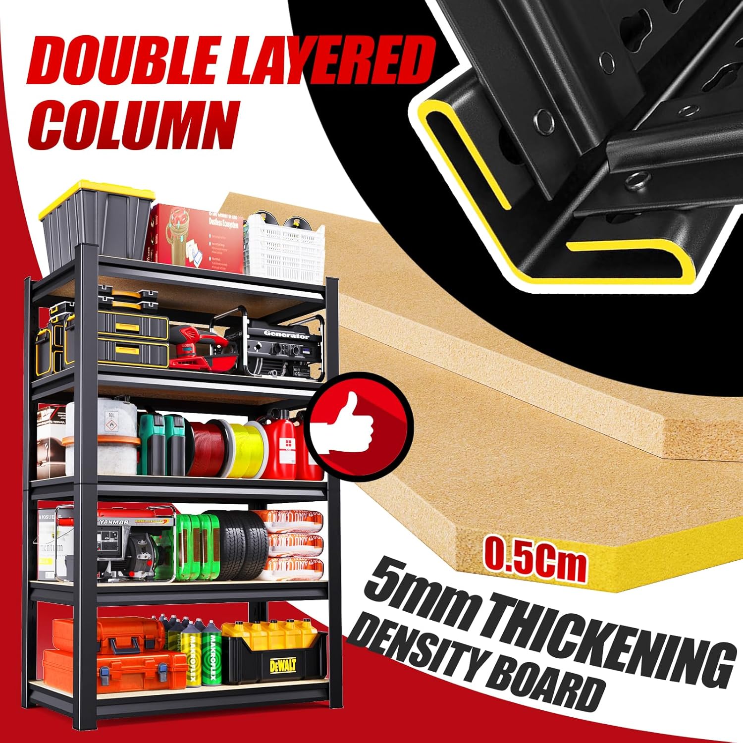- 【Double Layer Column Design】Garage storage shelves are designed with double layer high strength steel columns, made of high quality steel metal frame + high density wood boards. It has more stable load bearing capacity than other single tier racks on the market. Each wood shelf is with support ribs to ensure that the garage shelving will not bend or deform even if each partition is loaded with 500 pounds, double guarantee, so you can store your things with peace of mind.