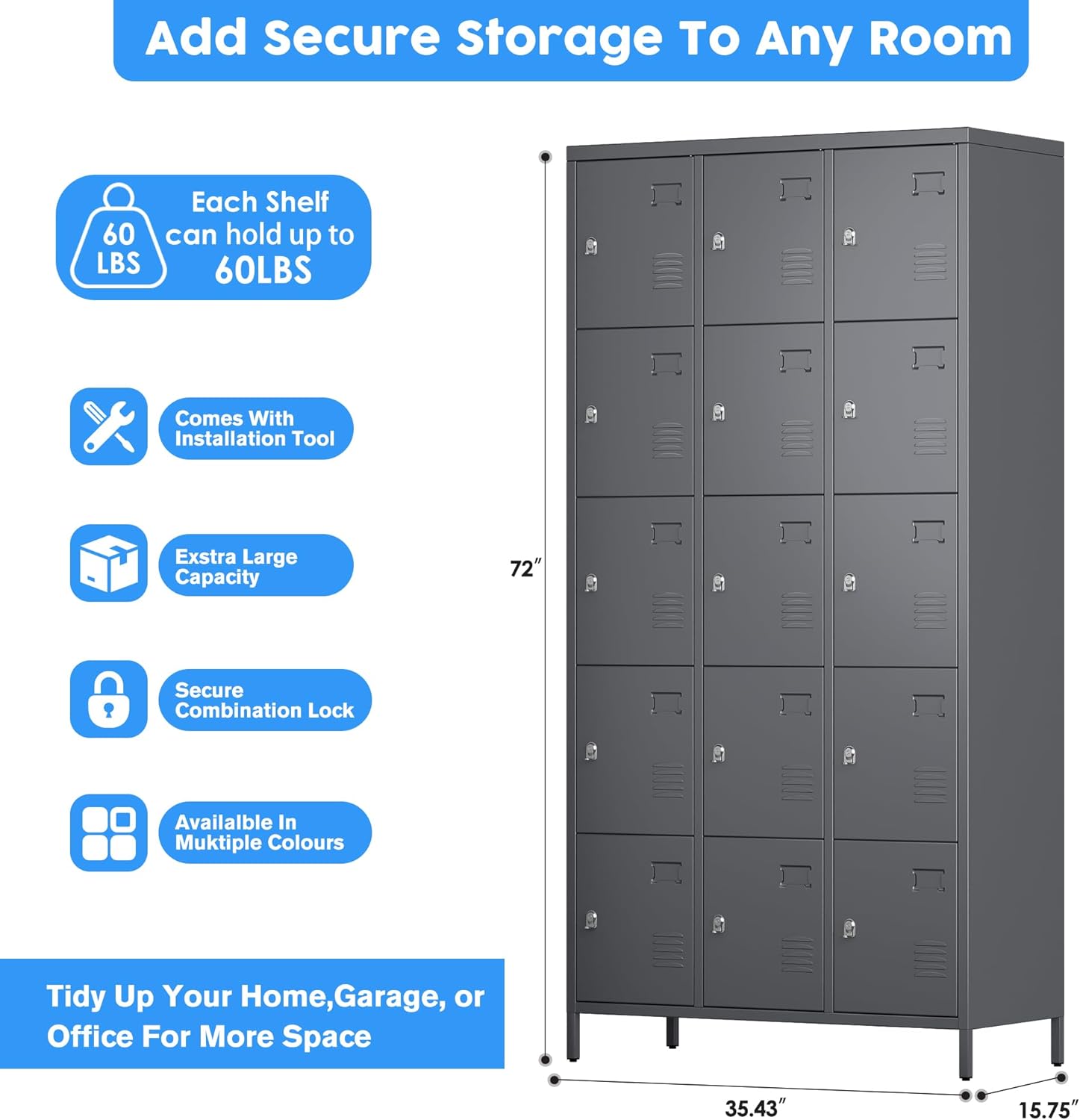 - [Card Holder and Combination Cabinet]:The metal locker have business card holders on each door for employee or student names.15 doors metal locker are equivalent to fifteen separate cabinets together, more storage space,can be used as employee lockers, children's lockers, locker room lockers, school lockers, etc.