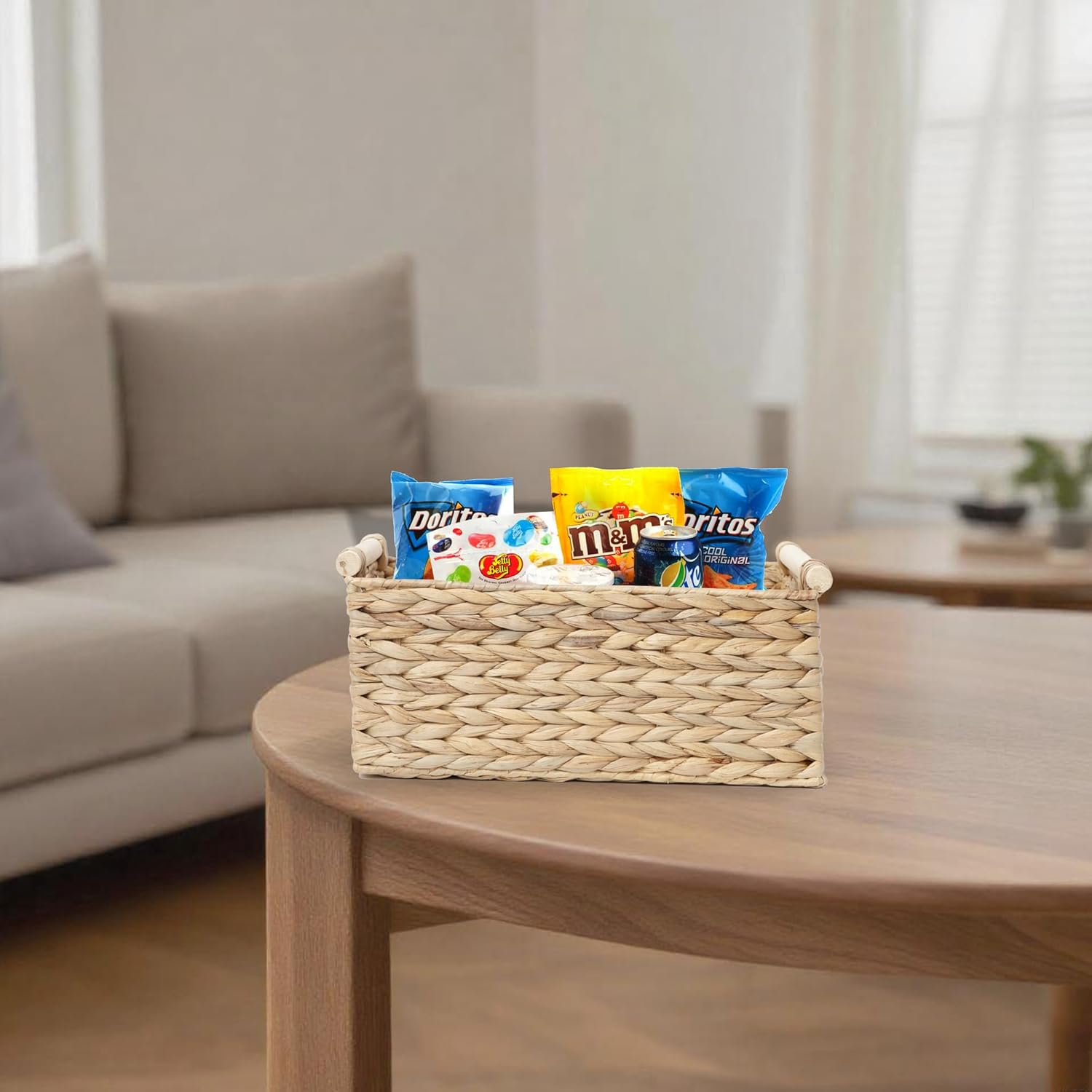 Handmade Water Hyacinth Woven Storage Baskets with Wooden Handles, Rectangle Rustic Organizer Set for Home Decor, Kitchen, Bedroom & Office (Medium)