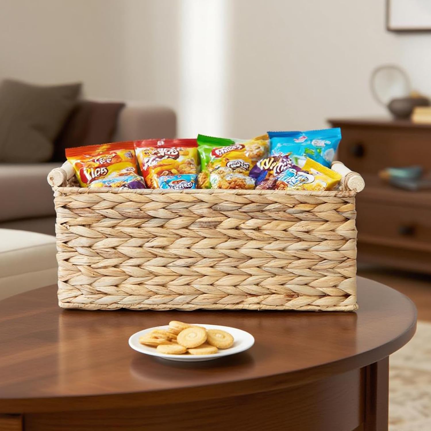 Handmade Water Hyacinth Woven Storage Baskets with Wooden Handles, Rectangle Rustic Organizer Set for Home Decor, Kitchen, Bedroom & Office (Set of 3)