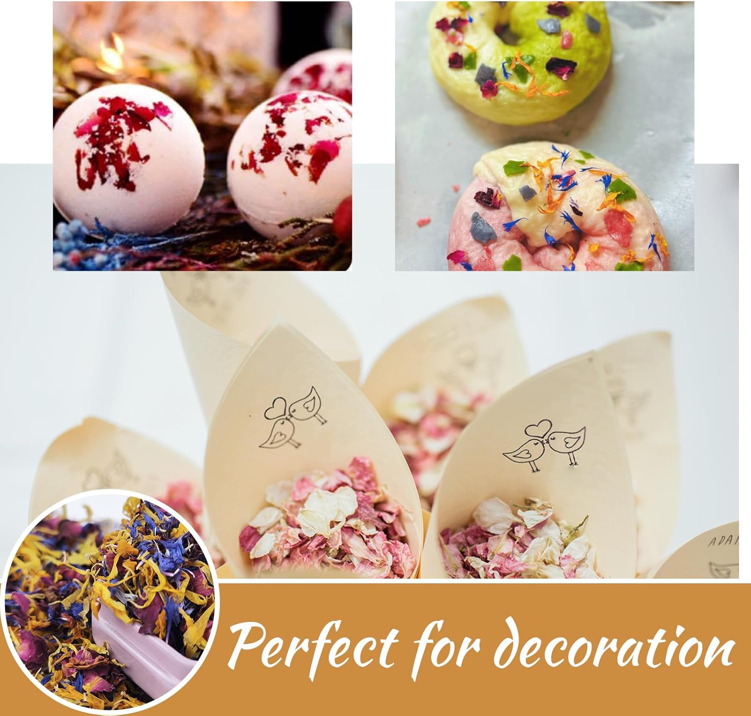 - DIY Craft Uses: Carefully handpicked flowers retain their colors and fragrance, used for cakes, potpourri, bath bombs, bath salts, confetti and table centerpieces