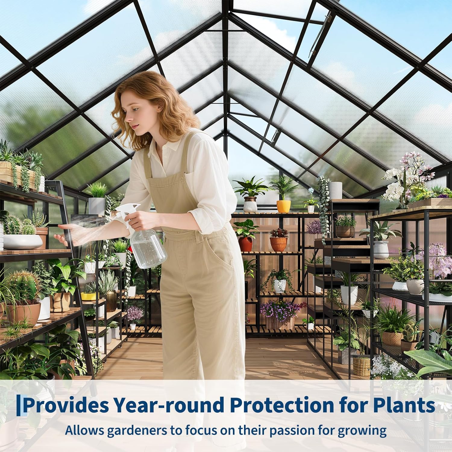- 【Professional-Grade Protective Panels】This greenhouse uses 720g/m² polycarbonate protective panels, which an ideal balance between durability and adaptability for plant growth. These panels effectively filter 70% of natural light while blocking 99.9% of harmful UV . They provide careful care for young seedlings and reliable protection for mature plants. Whether placed on a terrace, courtyard, or balcony, it maintains optimal growing conditions for a variety of plants.