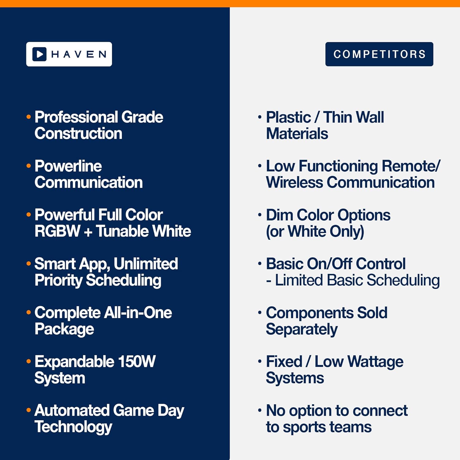 - Game Day & Holiday Ready - Only Haven offers real-time Game Day Technology, syncing your lights to touchdowns or wins. Year-round Scenes automatically update for holidays, even floating dates, making it the most customizable outdoor lighting system available.