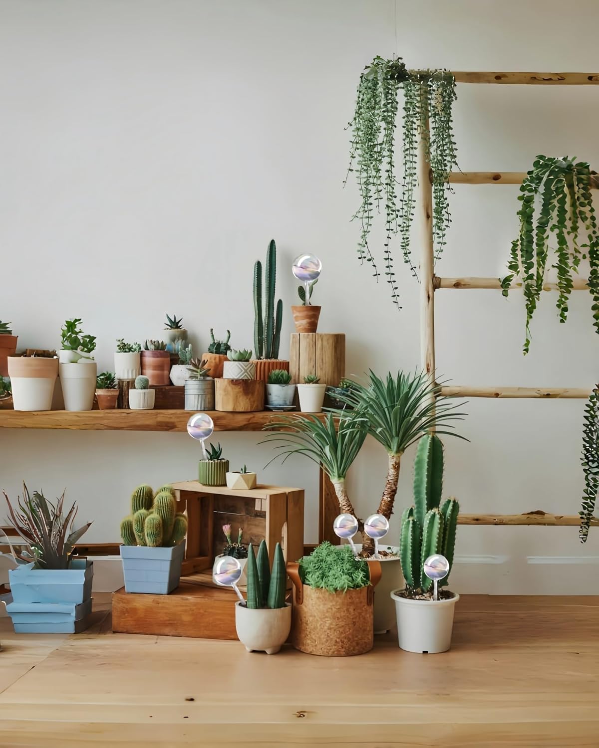 - 【Premium Hand-Blown Glass】Each watering globe is crafted from high-quality glass using traditional hand-blown techniques. The iridescent laser-etched surface creates beautiful rainbow light gradients in sunlight, making these functional plant waterers equally stunning as decorative pieces