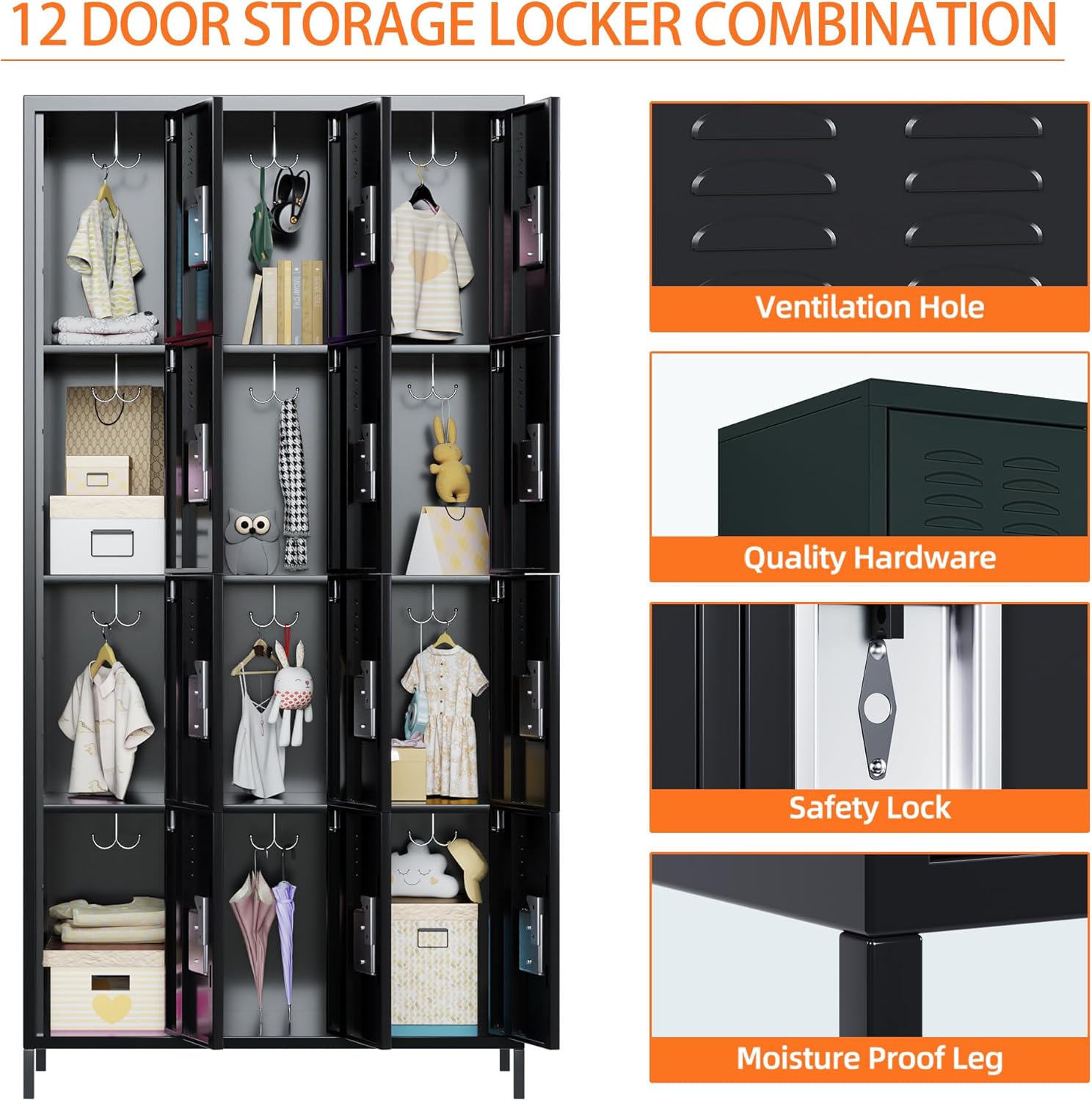 Aobabo 12 Doors Metal Storage Locker for Employees, Storage Locker with 12 Hooks for Garage School Office Gym, Black, Assembly Required