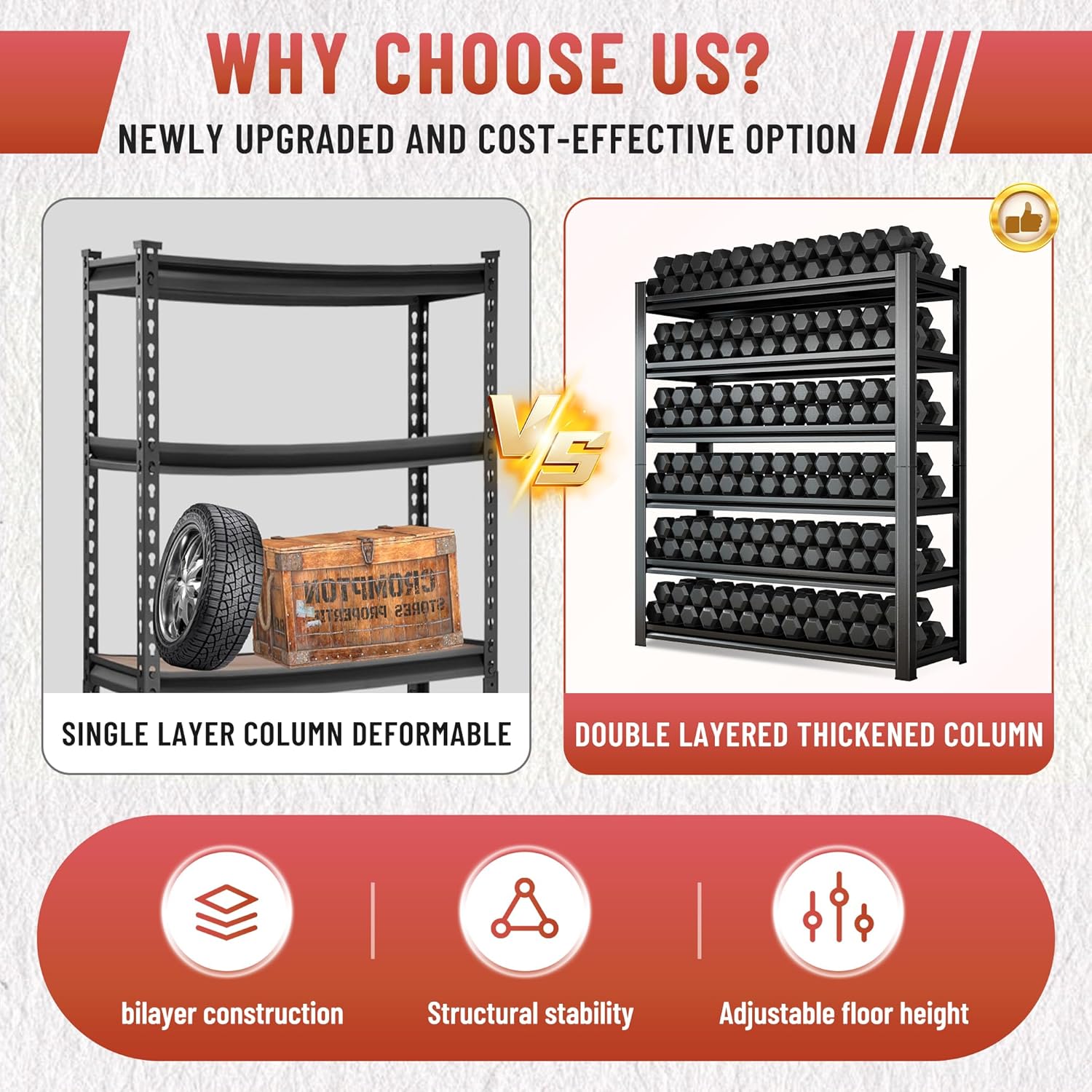 - 【Heavy-Duty Construction】Our Garage Shelving is built to last. With fully steel shelves and double-thick columns, this shelving unit provides exceptional strength and durability, ensuring that your storage needs are met with confidence