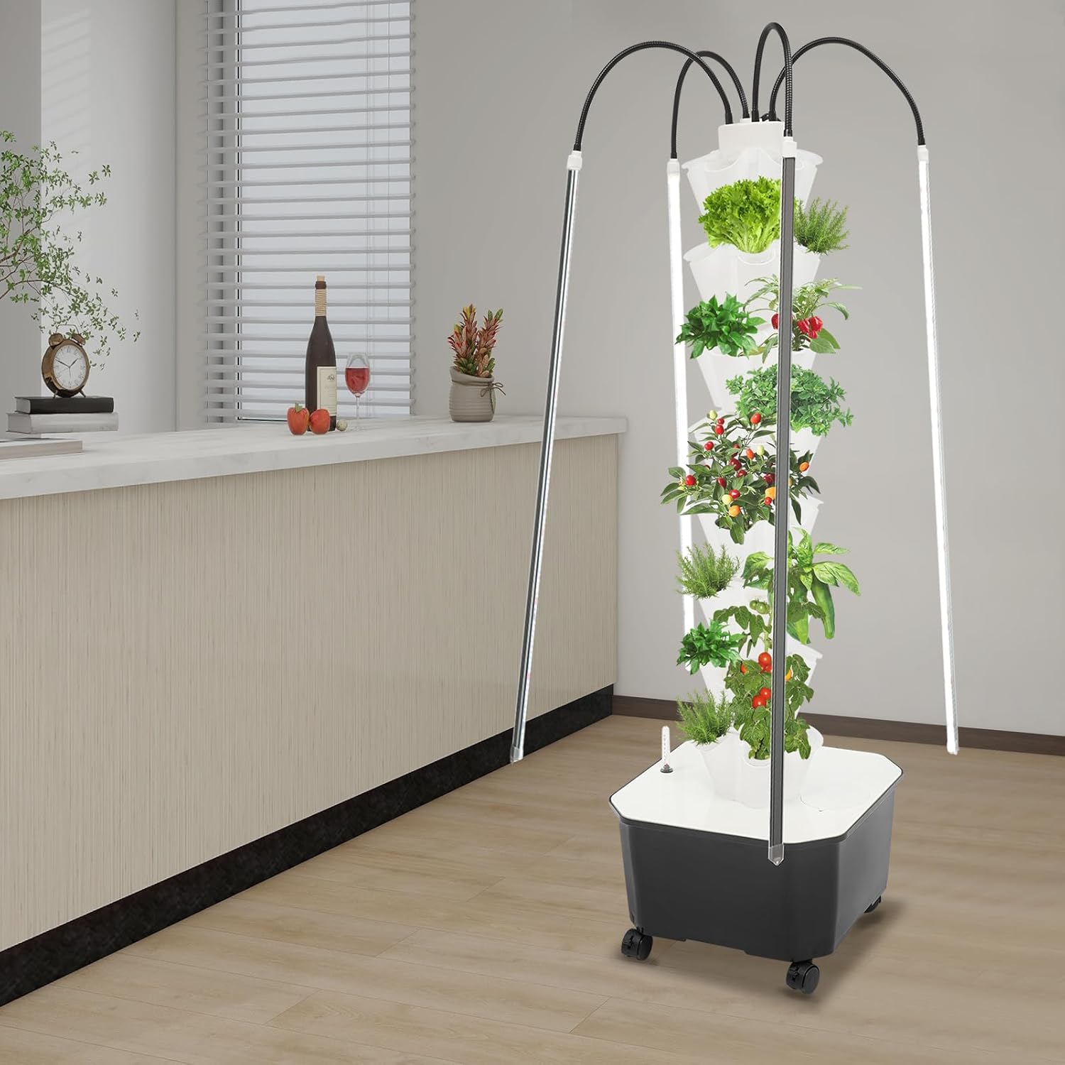 Hydroponics Growing Tower w/LED Light,8 Tiers 40-Hole Vertical Planter Tower,Smart Garden Growing System Kit for Fruits Vegetables Herbs (White)